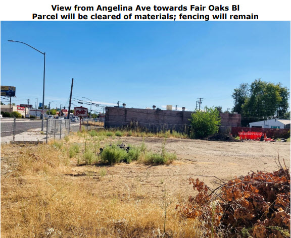 Corner with Angelina Ave, parcel will be cleared of materials; fencing will remain