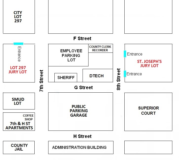 Juror parking is available at either the St. Joseph's Jury lot or Jury Lot 297. The St. Joseph's Jury Lot is located on 8th Street between F and G Streets (entrance on 8th Street). Jury Lot 297 is located on 7th Street between F and G Streets (entrance on F Street).